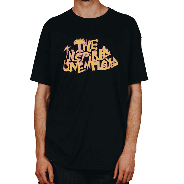Black short sleeve t-shirt with The Inspired Unemployed logo.